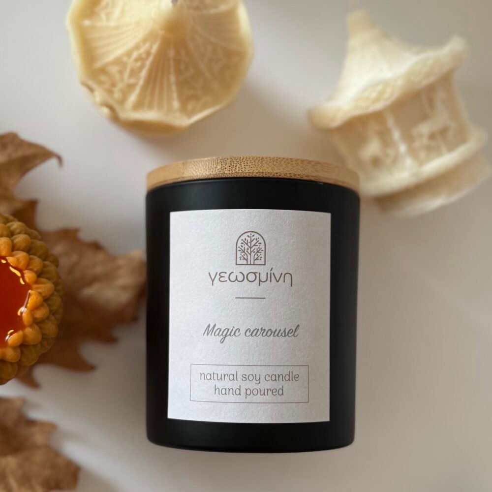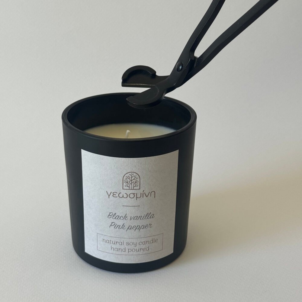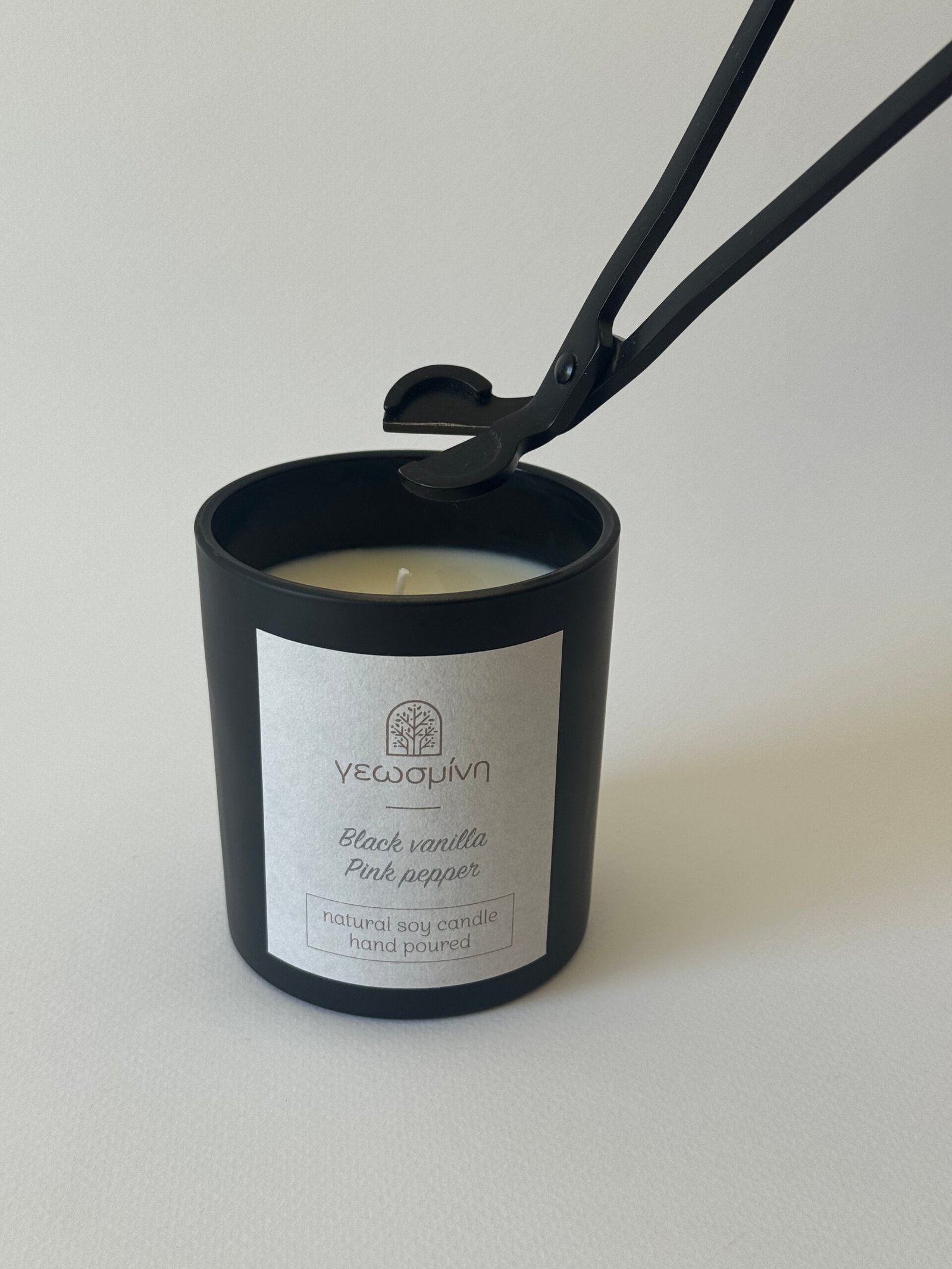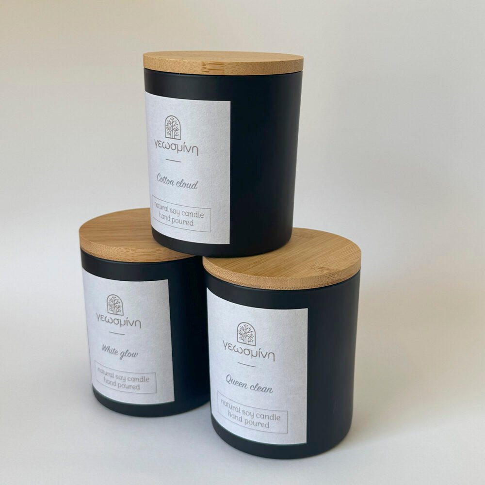 Αρωματικό κερί σόγιας σε μαύρο δοχείο, με ξύλινο καπάκι που προστατεύει το κερί σας από τη σκόνη, διατηρεί για περισσότερο καιρό το άρωμα του κεριού σας αλλά χρησιμοποιείται και ως βάση για το δοχείο. Επιλέξτε οποιοδήποτε από τα διαθέσιμα αρώματα μας και δημιουργήστε μοναδική ατμόσφαιρα στο χώρο σας