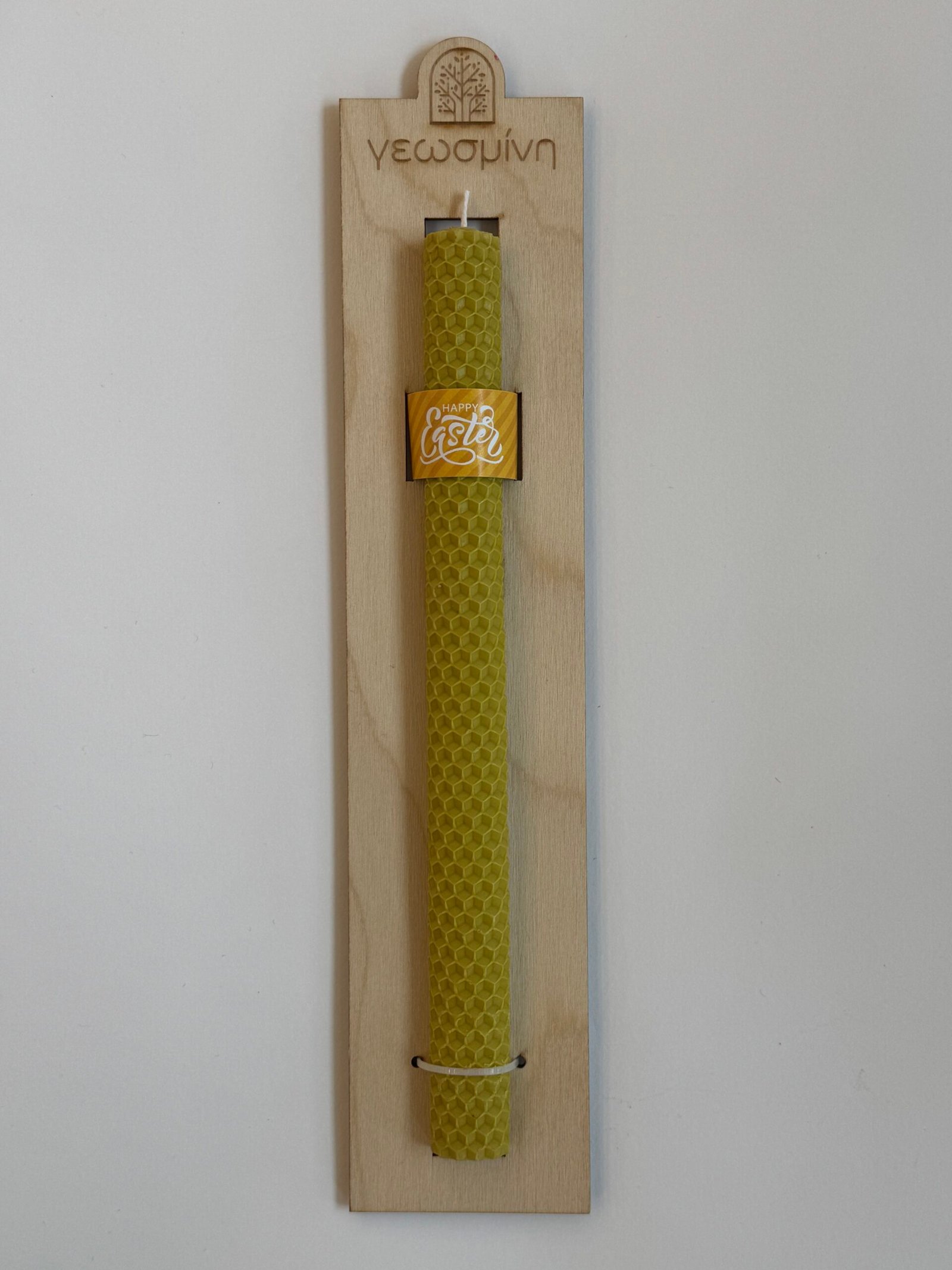 Χειροποίητη λαμπάδα από χρωματιστό φύλλο κηρήθρας, τοποθετημένη σε ξύλινη βάση με το λογότυπο μας