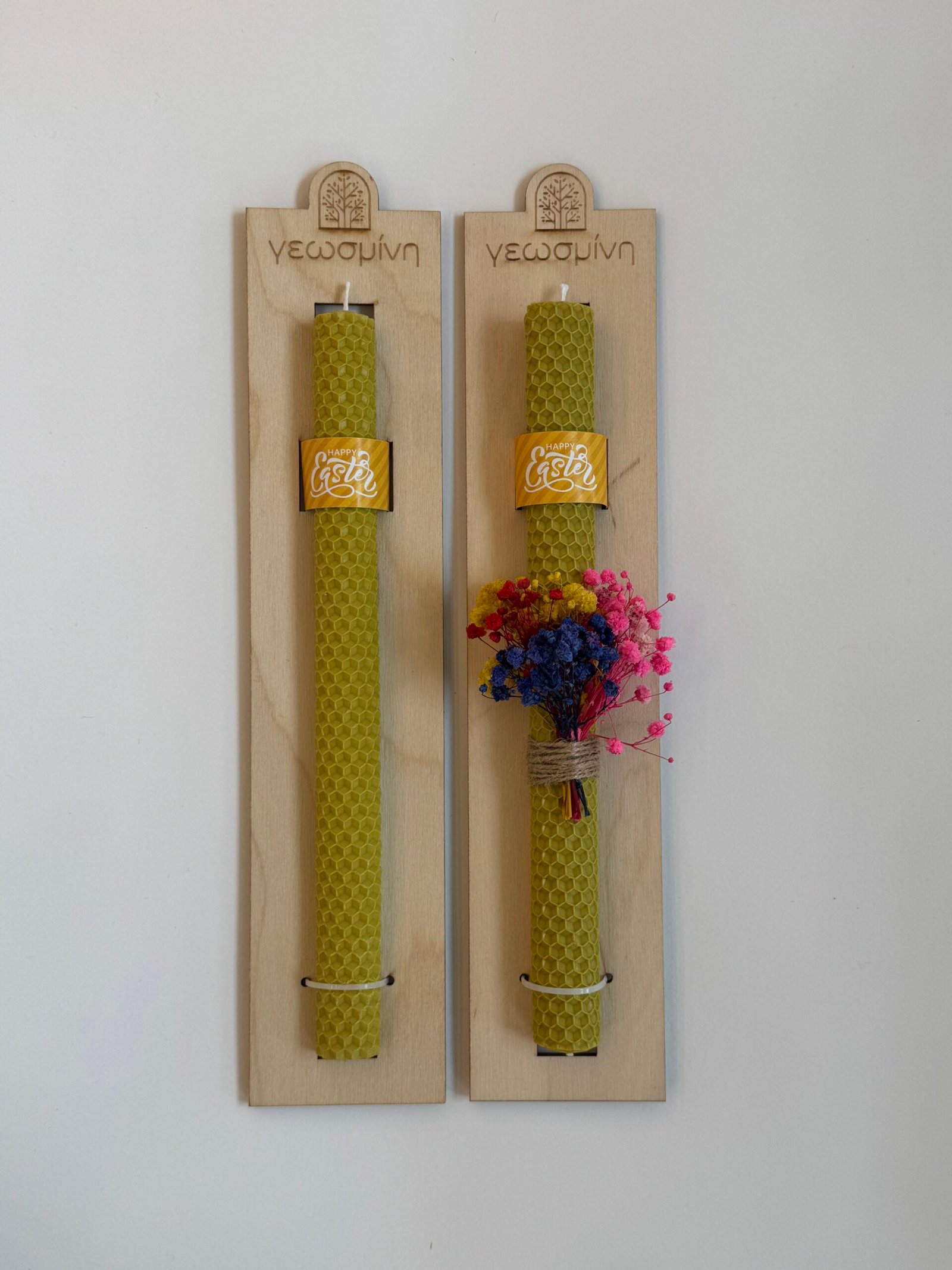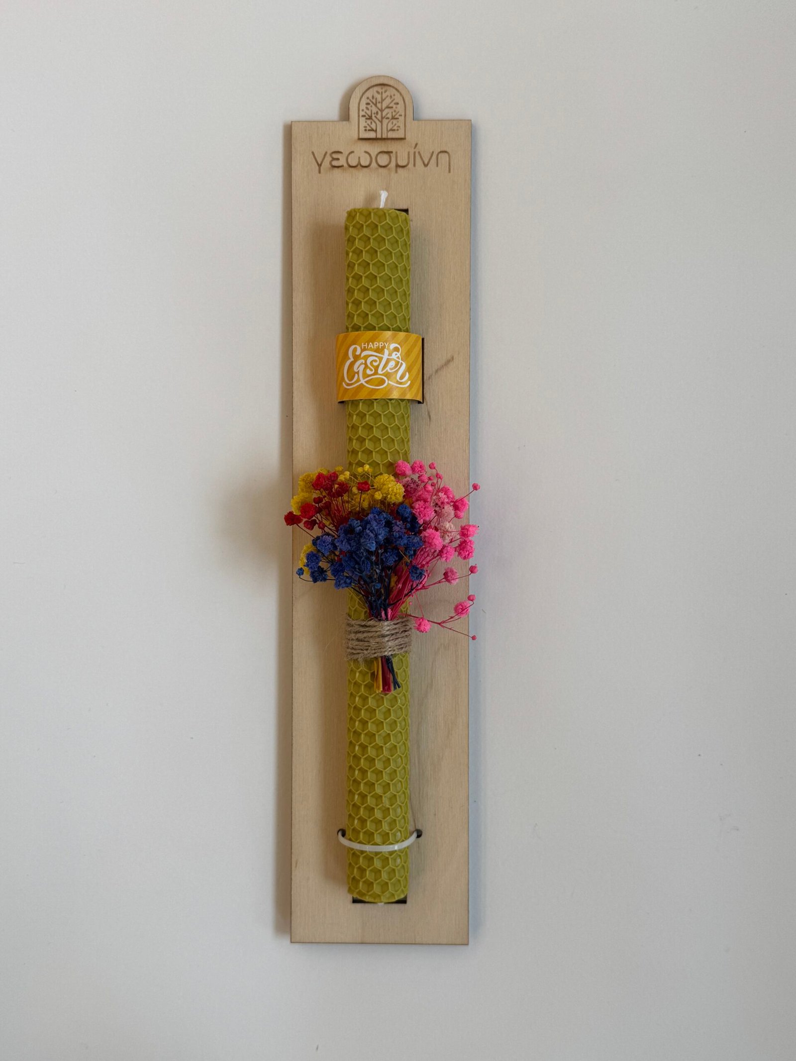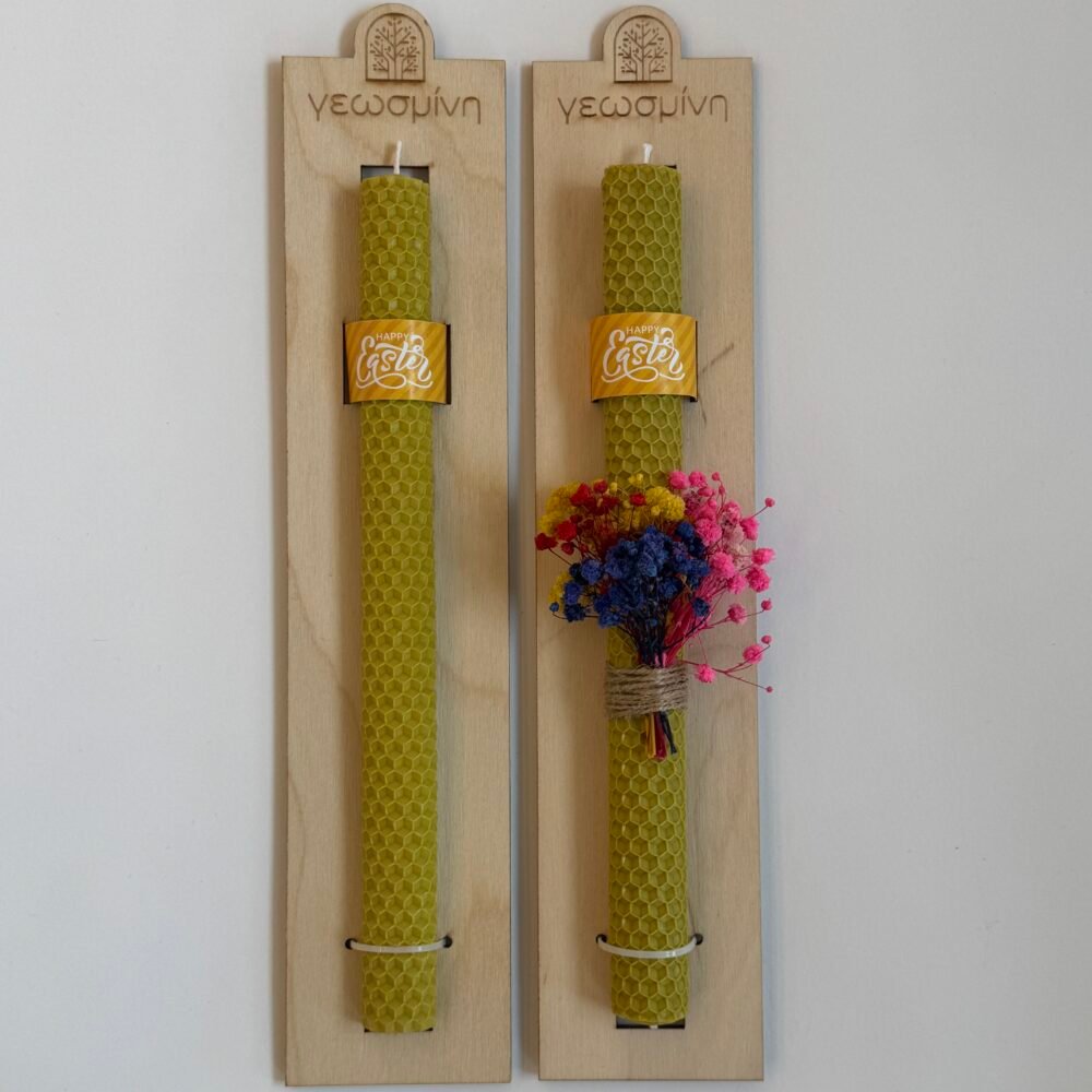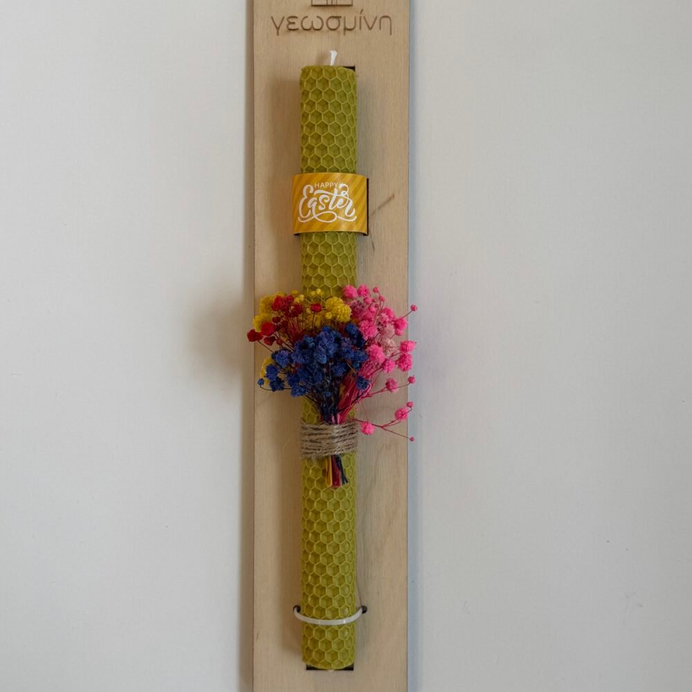 Χειροποίητη λαμπάδα από χρωματιστό φύλλο κηρήθρας, τοποθετημένη σε ξύλινη βάση με το λογότυπο μας