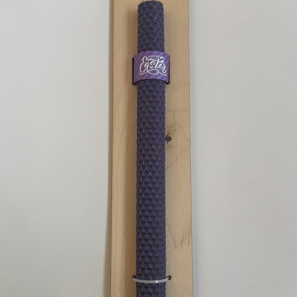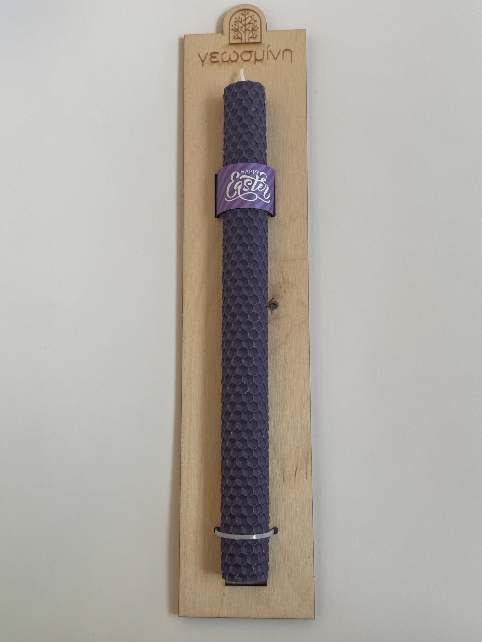 Χειροποίητη λαμπάδα από χρωματιστό φύλλο κηρήθρας, τοποθετημένη σε ξύλινη βάση με το λογότυπο μας